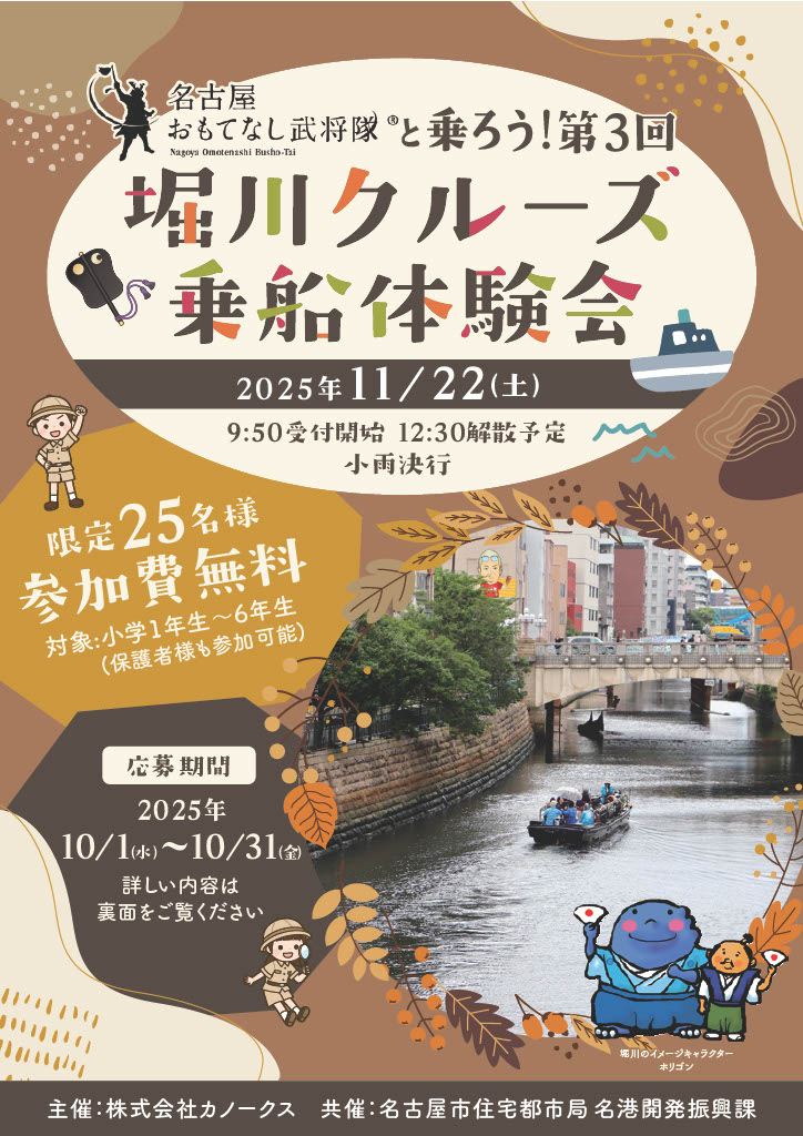 本イベントは、地元の小学生と保護者を対象に、名古屋城前から納屋橋までの堀川をクルーズ船で往復する体験型企画です。堀川の魅力発信や地域社会への啓発活動の一環として、昨年よりカノークスと名港開発振興課が協力して実施しており、今回で3回目を迎えました。
